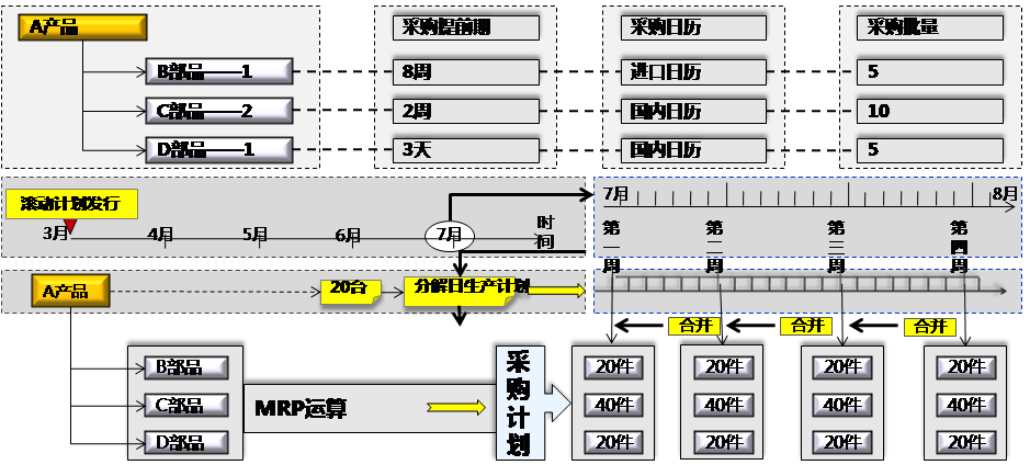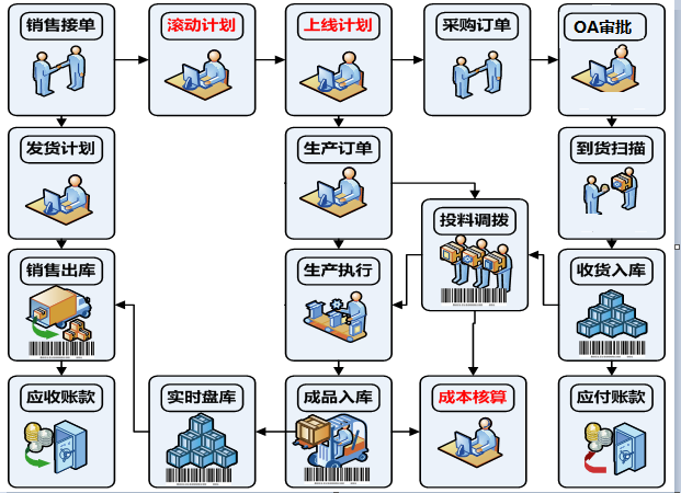 1. 銷售接單后,計劃部門編排1個月的滾動計劃,MPS運算出生產計劃、MRP運算出采購計劃。